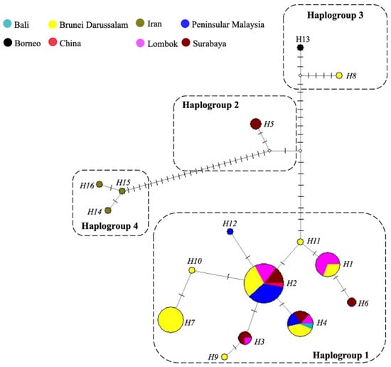 Haplotype analysis revealed a total of 16 different haplotypes (H1-H16) from the 84 samples from this study and 11 other samples obtained from the GenBank database (Table 1). DNA polymorphism analysis showed that Surabaya samples were relatively more diverse, with the highest haplotype diversity and nucleotide diversity, and Peninsular Malaysia samples having the lowest haplotype diversity and nucleotide diversity (Table 2).