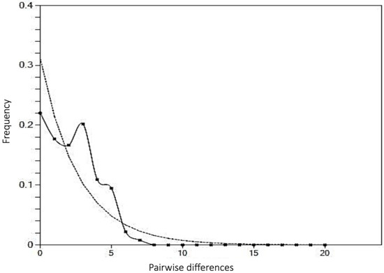 A mismatch distribution analysis was carried out based on the observed population structure. However, considering that three of the four haplogroups had low sample numbers, only haplogroup 1 was tested. A plot of the mismatch distribution (Figure 5) shows the observed distribution had a unimodal curve, suggesting a recent population expansion. This was supported by the sum of squared deviation (SSD = 0.004, p = 0.83), which did not reject the null hypothesis of a recent demographic expansion. Similarly, Harpending’s raggedness index (r = 0.018, p = 0.94) also provided support to population expansion. On the other hand, the neutrality tests did not provide any support to population expansion. Both Tajima’s D and Fu’s Fs values were negative (D = −0.19; Fs = −1.92). Negative values for either test suggest an excess of low frequency polymorphisms, which is a signature for population expansion. However, these values were not significant for Tajima’s D (p = 0.42) and Fu’s Fs (p = 0.25), which did not indicate significant population expansion.