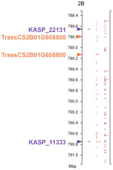 Annotated genes located between the markers flanking LrAW2 were extracted from the IWGSC genome assembly of wheat cv. Chinese Spring v1.0 using the tool Pretzel (https://plantinformatics.io (accessed on 20 May 2022). Functional annotations for these genes were obtained from the IWGSC RefSeq data repository at INRA (https://urgi.versailles.inra.fr/download/iwgsc/IWGSC_RefSeq_Annotations/v1.0 (accessed on 20 May 2022). Ninety annotated genes (36 high-confidence and 54 low-confidence) were identified between the two KASP markers that flanked Lr82. Of these, two genes (TraesCS2B01G608500 and TraesCS2B01G608800) are predicted to encode TIR-NBS-LRR disease resistance proteins, based on the IWGSC RefSeq gene annotation. These could be candidate genes for Lr82 (Figure 2).