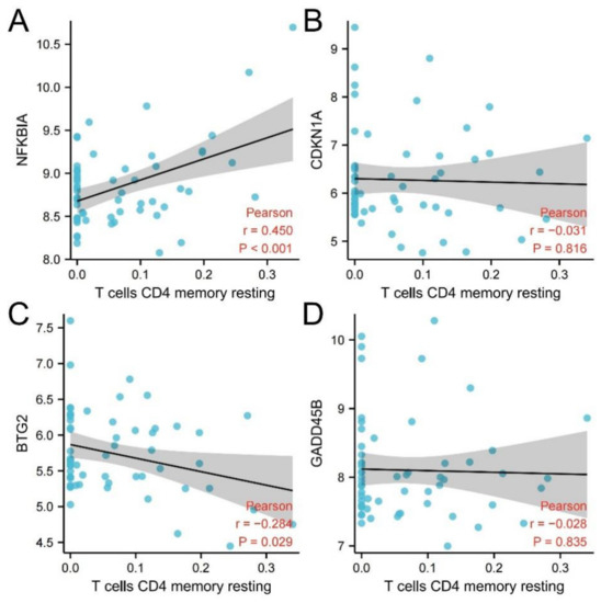 | Pearson | Resting memory CD4 T cells | GADD45B | r = −0.028 | −0.512–0.001 | 0.835 |