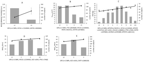 To establish a GPSDD, a backward linear regression with age and individual SNP GSs included in the model was performed to identify the SNPs associated with investigated skeletal muscle phenotypes (biceps brachii thickness, VLACSA, HGS, MVCEF, and MVCKE). The significance levels for entry and exit in the model were 0.1 and 0.05, respectively. In the instance when the β coefficient was negative, the scoring of the predisposing allele was reversed from the initial scoring. Then, a GPS was calculated for each phenotype by summing GSs of only those SNPs associated with the selected skeletal muscle phenotype in the backward linear regression (p < 0.1) as described previously []. Finally, linear regressions were carried out with GPS and age as independent variables, and skeletal muscle phenotypes as dependent variables.