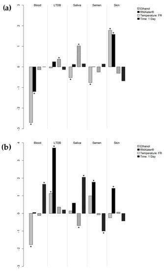 Coefficients on the y-axis (log scale) represent the mean increase or decrease in genomic DNA (a) and total RNA (b) concentrations when different moistening agents, storage temperatures (FR: frozen), and storage times before processing were applied to collection swabs, compared to the standard procedure (i.e., swabs moistened with water and stored at room temperature for 7 days before extraction). Significant p-values are marked with an asterisk. LTDB: luminol-treated diluted blood.