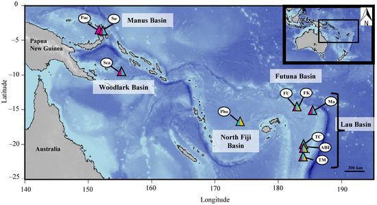 - Boulart, C.; Rouxel, O.; Scalabrin, C.; Le Meur, P.; Pelleter, E.; Poitrimol, C.; Thiébaut, E.; Matabos, M.; Castel, J.; Tran Lu, Y.A.; et al. Active hydrothermal vents in the Woodlark Basin may act as dispersing centres for hydrothermal fauna. Commun. Earth Environ. 2022, 3, 64. [Google Scholar] [CrossRef]