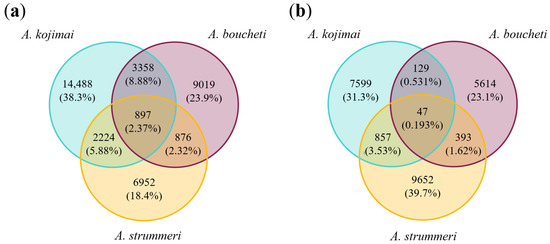 - Gayral, P.; Melo-Ferreira, J.; Glémin, S.; Bierne, N.; Carneiro, M.; Nabholz, B.; Lourenco, J.M.; Alves, P.C.; Ballenghien, M.; Faivre, N.; et al. Reference-Free Population Genomics from Next-Generation Transcriptome Data and the Vertebrate–Invertebrate Gap. PLoS Genet. 2013, 9, e1003457. [Google Scholar] [CrossRef] [PubMed]