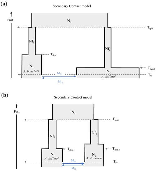 - Bouchemousse, S.; Liautard-Haag, C.; Bierne, N.; Viard, F. Distinguishing contemporary hybridization from past introgression with postgenomic ancestry-informative SNPs in strongly differentiated Ciona species. Mol. Ecol. 2016, 25, 5527–5542. [Google Scholar] [CrossRef]