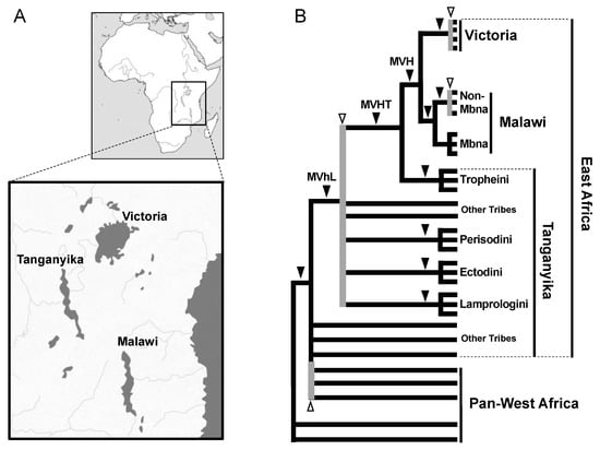 Phylogeny of East African cichlids. (A) Geography of the East African Great Lakes Victoria, Tanganyika, and Malawi. (B) Phylogenetic tree of East African cichlids based on results of the SINE method. Most major clades, such as Lake Victoria (V), Lake Malawi (M), MVH (M + V + Haplochromini), MVHT (MVH + Tropheini), MVhL (MVHT + Eretmodini, Perissodini, Cyprichromini, Limnochromini, Ectodini, and Lamplologini), and each of the four tribes in Tanganyika, are supported by multiple consistent SINE insertions (black arrowheads). SINE insertion patterns are inconsistent among the species in Lake Victoria, among non-Mbna species in Lake Malawi, and among the tribes of Lake Tanganyika, demonstrating that ILS was caused by rapid speciation (white arrowheads with gray vertical lines). Note that inconsistent SINE insertions were also detected in non-East Africa lineages, implying that hidden radiation occurred before the radiation of East African cichlids [56].
