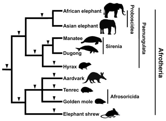 - Nishihara, H.; Satta, Y.; Nikaido, M.; Thewissen, J.G.; Stanhope, M.J.; Okada, N. A retroposon analysis of Afrotherian phylogeny. Mol. Biol. Evol. 2005, 22, 1823–1833. [Google Scholar] [CrossRef]