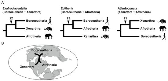 The root of the eutherian tree remains another critical issue of mammalian phylogenetics. Molecular phylogenetics and our retroposon insertion studies revealed that eutherian mammals can be classified into three major groups, namely Afrotheria, Xenarthra, and Boreoeutheria (or Boreotheria). However, the relationships among the three groups constituted a highly challenging issue—even based on the analyses of a large number of gene datasets [81]. This issue is noteworthy because species of these three groups inhabit different continents, i.e., Afrotheria, Xenarthra, and Boreoeutheria are considered to have originated in Africa, South America, and Laurasia (Eurasia + North America), respectively. Therefore, the divergence of the three lineages is considered to have coincided with continental drift on the geologic timescale [80]. It is believed that an ancient supercontinent was divided into the two supercontinents of Laurasia and Gondwana, the latter of which was further divided into Africa and South America based on the spatiotemporal distribution of magnetic stripes in the bedrock of the Atlantic Ocean floor [86]. Although some retroposon studies identified two L1 insertions that are shared between Boreoeutheria and Afrotheria and two other insertions shared between Xenarthra and Afrotheria, the evolutionary history of the split from the most recent common ancestor of Eutheria was poorly understood. We compared all L1 insertions available in data for the human, armadillo, and elephant genomes, as these species are representatives of Boreoeutheria, Xenarthra, and Afrotheria, respectively. As a result, 22, 25, and 21 L1 insertions were identified that support the basal Afrotheria, basal Xenarthra, and basal Boreoeutheria hypotheses, respectively (Figure 7A) [18]. This adequate number of retroposon loci that show conflict with each other is robust evidence for the occurrence of extensive ILS. Therefore, retroposon data revealed that the eutherian common ancestor diverged into three lineages almost simultaneously or over a short period. Another research group reached the same conclusion based on multiple incongruent retroposon insertion patterns [87].