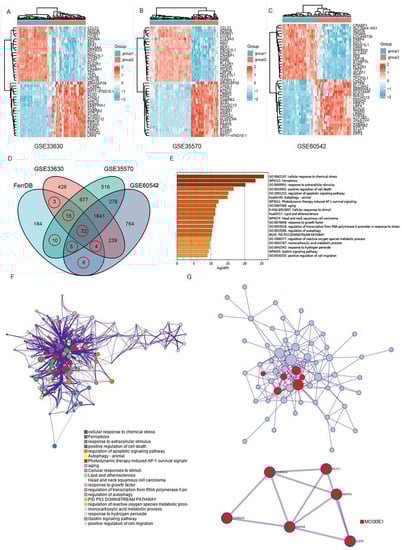 Brief summary of the ferroptosis signals that are differentially expressed in THCA: (A–C) Ferroptosis-related gene expression profiles in normal and tumor samples in the datasets. The expression of genes was used to group them together. High expression is represented by red, whereas low expression is represented by blue; (D) a Venn diagram depicting the dysregulated ferroptosis genes that were found in all four datasets; (E,F) a graph depicting the GO and KEGG analyses based on Metascape Online, as well as a bar plot and a network depicting the distribution and relationships between the various functions; (G) the hub genes in the ferroptosis gene collection are shown in the PPI network and MCODE. Red balls are MCODE1.