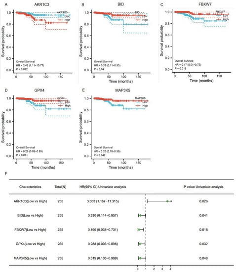 The prognostic ferroptosis signature was plotted using Kaplan–Meier plots and forests plots: (A–E) Kaplan–Meier plots showing the ferroptosis genes with prognostic values; (F) the forest plot showing the results of the univariate Cox regression analyses.