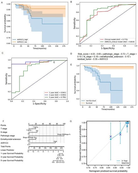 The predictive model construction. (A) Kaplan–Meier survival curves of the AKR1C3_high group and AKR1C3_low group; (B) ROC curves of the AKR1C3_clinical model and clinical model; (C) ROC curves of the AKR1C3_clinical model and clinical model at one, two, and five years; (D) risk score of the AKR1C3_clinical model; (E) Kapla–Meier survival curves of the predictive survival group and predictive non-survival group using the AKR1C3_clinical model; (F) Proposed nomogram to predict 1-,3-, and 5- OS for THCAe; (G) calibration curve for the probability of the 3-year OS.