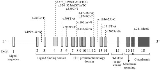 Fifteen of the detected pathogenic mutations were located within the LDLR gene (c.190+1G>A, c.284G>T, c.373_379delCAGTTCG, c.324_325delGTinsTC, c.530C>T, c.798T>A, c.907C>T, c.1061A>G, c.1433G>A, c.1775G>A, c.1747C>T, c.1846-2A>C, c.1916T>A, c.2063delA, c.2416dupG). The affected exons of LDLR were 3–6, 8, 10, 12–14, 17. The gene structure with the positions of the variants are presented in Figure 1.