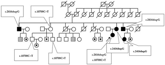 The diagram presents the inheritance of variants c.2416dupG and c.10708C>T in the proband’s family. Phenotypically affected members are marked by black. Patients with slightly elevated total cholesterol level are flagged by a diagonal slash. Examined patients with no clinical symptoms are marked with a cross.