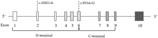 Within the LPL gene, two variants were identified: c.106G>A p.(Asp36Asn) and c.953A>G p.(Asn318Ser) (Figure 6). The gene structure with the variant positions are presented in Figure 6.