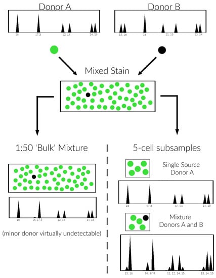 Undetectable/unresolvable minor donor analysis scheme. Standard “bulk” sampling results in a DNA profile that appears likely single source for individual A where individual B’s genotype cannot be distinguished (left side). The minor donor (B) is undetectable/barely detectable (left side). Simplified micromanipulation subsampling (DSCS) of the same mixture using a 5-cell subsampling size results in single source profiles of individual A and 1:4 mini-mixture samples of individuals A and B (right side, A is major donor and B is the minor donor)). These mini-mixture subsamples are then analyzed with PG validated for one or few cells.