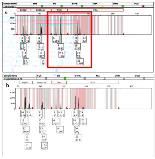 Undetectable/unresolvable minor donor analysis. (a) Standard “bulk” approach in which the only indication of a possible minor contributor is the 9.3 and 24 alleles (red box) and (b) 5-cell mini-mixture obtained by DSCS indicating the clear presence of a mixture.