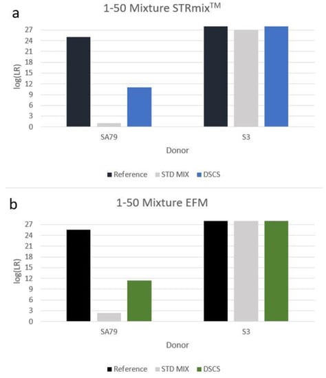 Increased minor donor contributor log(LR) recovery in a 1:50 2-person mixture by DSCS compared to standard PG mixture analysis. STRmixTM (a) and EuroForMix (b).
