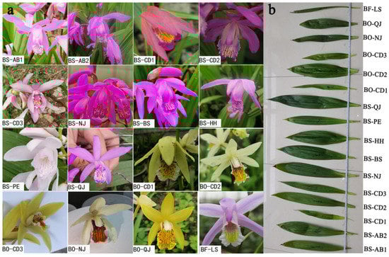 Morphology of sixteen samples in Bletilla. (a) Flower, (b) Leaf. BS-AB1: B. striata from Aba, Sichuan No 1; BS-AB2: B. striata from Aba, Sichuan No 2; BS-CD1: B. striata from Dujiangyan, Sichuan No 1; BS-CD2: B. striata from Pengzhou, Sichuan No 2; BS-CD3: B. striata from Chongzhou, Sichuan No 3; BS-NJ: B. striata from Neijiang, Sichuan; BS-BS: B. striata from Baoshan, Yunnan; BS-HH: B. striata from Honghe, Yunnan; BS-PE: B. striata from Pu’er, Yunnan; BS-QJ: B. striata from Qujing, Yunnan; BO-CD1: B. ochracea from Jingtang, Sichuan No 1; BO-CD2: B. ochracea from Dujiangyan, Sichuan No 2; BO-CD3: B. ochracea from Dujiangyan, Sichuan No 3; BO-NJ: B. ochracea from Neijiang, Sichuan; BO-QJ: B. ochracea from Qujing, Yunnan; BF-LS: B. formosana from Leshan, Sichuan.