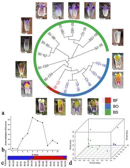 (a) Phylogenetic tree; (b) Cross-validation error rate of each k value of admixture; (c) Cross-validation error rate of each k = 2 value of admixture; (d) Three-dimensional cluster diagram (PC1, PC2, and PC3). BS-AB1: B. striata from Aba, Sichuan No 1; BS-AB2: B. striata from Aba, Sichuan No 2; BS-CD1: B. striata from Dujiangyan, Sichuan No 1; BS-CD2: B. striata from Pengzhou, Sichuan No 2; BS-CD3: B. striata from Chongzhou, Sichuan No 3; BS-NJ: B. striata from Neijiang, Sichuan; BS-BS: B. striata from Baoshan, Yunnan; BS-HH: B. striata from Honghe, Yunnan; BS-PE: B. striata from Pu’er, Yunnan; BS-QJ: B. striata from Qujing, Yunnan; BO-CD1: B. ochracea from Jingtang, Sichuan No 1; BO-CD2: B. ochracea from Dujiangyan, Sichuan No 2; BO-CD3: B. ochracea from Dujiangyan, Sichuan No 3; BO-NJ: B. ochracea from Neijiang, Sichuan; BO-QJ: B. ochracea from Qujing, Yunnan; BF-LS: B. formosana from Leshan, Sichuan.