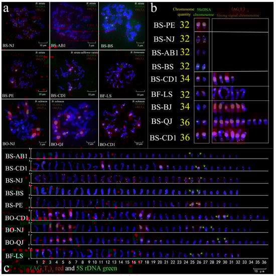 Considering the number of chromosomes is a useful way to distinguish between species. FISH has widely been used to measure the genetic relationships among plant species [,], phylogenetic reconstruction [], and homologous chromosome identification [,], and the results are reliable and fast []. Chromosome data are useful for species classification and the basis of cytogenetics. Through karyotyping between Bletilla, information about the origin, phylogeny, genetic breeding, and variety improvements in different species can be learned [,]. The use of oligonucleotide systems enabled the first comprehensive cytogenetic analysis of Bletilla in the genomics era. A combination of 5S rDNA, and (AG3T3)3 probes has been used in Hibiscus mutabilis L. [], Hippophae rhamnoides L. [], Chimonanthus campanulatus R. H. Chang & C. S. Ding [], Juglans regia L. and J. sigillata Dode. [].