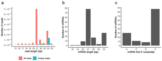 Features of sRNA reads and miRNA predictions. (a) Distribution of Illumina read lengths for all (red) and unique (blue) sRNA reads. (b) Distribution of miRNA lengths. (c) Number of miRNAs initiating with a 5′ A, C, G, or U.