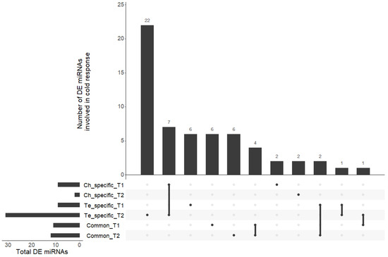 For both periods, we identified four sets of DEGs and differentially expressed miRNAs: (1) between LT and N in Ch at T1; (2) between LT and N in Ch at T2; (3) between LT and N in Te at T1; and (4) between LT and N in Te at T2. These sets were further used to pinpoint Ch- and Te-specific cold responsive genes and miRNAs as well as those involved in cold response common to both genotypes. T0 was treated as a control time point, since environmental conditions for both the LT and N experiments were identical until this sampling date. As such, mRNAs or miRNAs with unexpected differential expression between the LT and N conditions at T0 were removed from the lists of differential elements of interest.