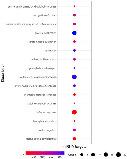Significantly (p-value < 0.05) enriched Gene Ontology (GO) biological process terms among miRNA targets. Counts indicate the number of targets annotated with each GO term, and dots are colored by p-value.