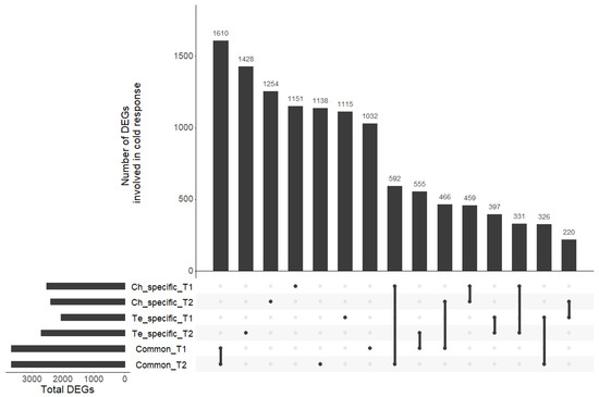 The transcriptomic responses of the two contrasted pea lines (Ch, frost tolerant; Te, frost susceptible) subjected to a cold acclimation treatment (4.5 °C; LT) or not (N) before applying frost was studied after different periods of cold exposure T1 and T2 [11]. For both periods, we identified four sets of DEGs: (1) between LT and N in Ch at T1 (Table S9); (2) between LT and N in Ch at T2 (Table S10); (3) between LT and N in Te at T1 (Table S11); and (4) between LT and N in Te at T2 (Table S12). These sets were then used to pinpoint Ch and Te-specific cold responsive genes (Tables S9–S12) and genes involved in cold response common to both genotypes (Tables S13 and S14). Among the various comparisons considered, we identified between two and four thousand differentially expressed genes under cold stress (Table 1). A total of 3663 and 3666 DEGs at T1 and T2, respectively, were involved in cold response in Ch and Te. A small number of genes was found to be involved in cold response at T1 and T2 in both genotypes but with discordant differential expressions. Some DEGs were found to have a consistent response regardless of the cold exposure period: 459 DEGs for the Ch-specific response, 397 DEGs for the Te-specific response, and 1610 DEGs for the common response to cold. We also observed cases of offsets in cold response between the two genotypes: for example, 220 DEGs in Te at T1 were also differentially expressed in Ch at T2, and 331 DEGs in Ch at T1 were differently expressed in Te at T2 (Figure 4).