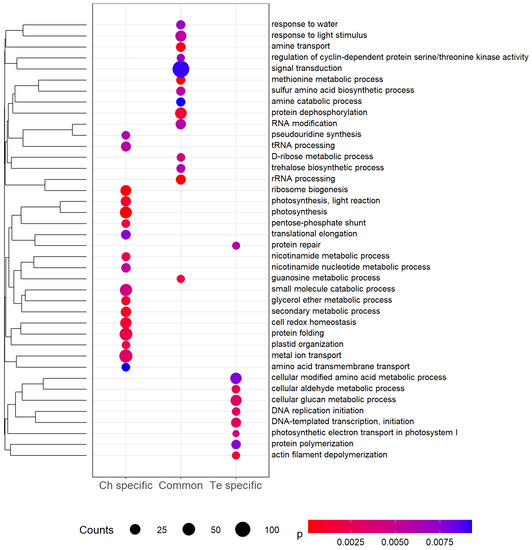 Significantly (p-value < 0.01) enriched Gene Ontology (GO) biological process terms among differentially expressed genes (DEGs) specific to Ch, Te, and common to the two genotypes. Counts indicate the number of DEGs annotated with each GO term, and dots are colored by p-value. GO terms are clustered using hierarchical clustering (complete linkage) using GOGO semantic similarity [38] between terms.