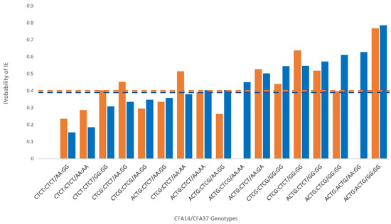 Canine chromosome 14 and 37 haplotype interactions and the probability of idiopathic epilepsy in the Belgian shepherd (BS) as a function of specific genotypic interactions. The orange bars represent the data from only the new cohort in the present study (n = 121), while the blue bars reflect the combined data for the new cohort and the published [1] cohort of BS dogs (n = 183). The dashed lines indicate the computed threshold (0.40 for orange and 0.39 for blue), with probabilities in excess of the lines indicating a significantly increased risk of IE.