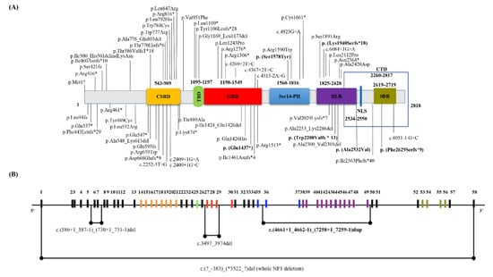 - Fahsold, R.; Hoffmeyer, S.; Mischung, C.; Gille, C.; Ehlers, C.; Kücükceylan, N.; Abdel-Nour, M.; Gewies, A.; Peters, H.; Kaufmann, D.; et al. Minor lesion mutational spectrum of the entire NF1 gene does not explain its high mutability but points to a functional domain upstream of the GAP-related domain. Am. J. Hum. Genet. 2000, 66, 790–818. [Google Scholar] [CrossRef]