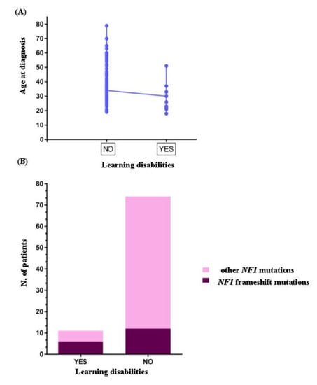 Studies looking at specific cognitive domains associated with NF1 have come to very different conclusions. In our cohort, we found a higher prevalence of learning disabilities in patients with NF1 frameshift mutations. Findings from several studies involving very young NF1 children confirm that developmental delays and subsequent academic difficulties and learning disabilities represent a major psychosocial burden during the life of NF1 patients. In addition, our study particularly highlights that cognitive aspects, such as the delay in the acquisition of psychomotor skills, unlike other symptoms, can be a warning sign, allowing for earlier diagnosis and a more effective therapeutic and rehabilitation approach to reduce residual cognitive impairment in multiple domains and the psychosocial impact of the disease. Hence, the perception of disease severity correlates with medical, behavioral, and cognitive severity scores, and the spectre of death from cancer or other complications has profound emotional, psychological, and social effects on all NF1 patients and their families. Therefore, for adequate genotype–phenotype analysis in NF1, better clinical management and appropriate genetic counseling we advocate a longitudinal, patient-centered model of care, with age-dependent monitoring of clinical manifestations aimed at early diagnosis and symptomatic treatment of emerging complications.