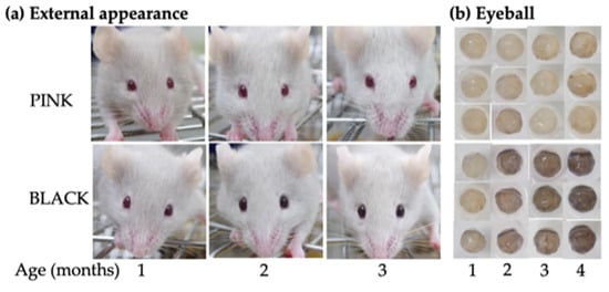 - Ishikawa, A.; Sugiyama, M.; Hondo, E.; Kinoshita, K.; Yamagishi, Y. Development of a novel pink-eyed dilution mouse model showing progressive darkening of the eyes and coat hair with aging. Exp. Anim. 2015, 64, 207–220. [Google Scholar] [CrossRef] [PubMed]