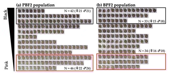 Distribution of eye color in F2 mice at 4 months of age: (a) 164 mice in the PBF2 population obtained from an intercross between a PINK female and a BLACK male; (b) 139 mice in the BPF2 population obtained from an intercross between a BLACK female and a PINK male. Approximately 25% of the mice with the darkest eye color surrounded by a black border and the lightest eye color surrounded by a red border were selected from each F2 population. N indicates the number of mice selected.