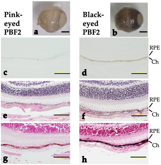 Stereomicroscopic and light-microscopic analyses of eyes from pink-eyed and black-eyed PBF2 male mice at 4 months of age: (a,b) Stereomicrographs; (c,d) unstained micrographs; (e,f) hematoxylin-eosin-stained micrographs; (g,h) Fontana-Masson-stained micrographs. RPE and Ch indicate retinal pigment epithelium and choroid, respectively. Scale bars show (a,b) 1 mm and (c–h) 100 μm.