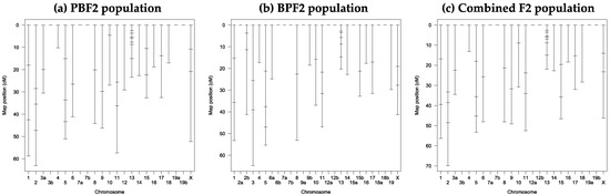 After genotyping 88 and 67 individuals selected from the PBF2 and BPF2 populations, respectively, three genetic linkage maps for the 69 markers were constructed with Map Manager QTX software, as shown in Figure 4. Summary statistics for the linkage maps are shown in Tables S5–S7. In the PBF2 population, 64 of the 69 markers were assigned to 18 linkage groups on 19 autosomes and the X chromosome with an average marker spacing of 14.3 cM (Table S5). In the BPF2 population, 54 markers were assigned to 23 linkage groups on 19 autosomes and the X chromosome with an average marker spacing of 14.5 cM (Table S6). In the combined F2 population, 62 markers were assigned to 17 linkage groups on 19 autosomes and the X chromosome with an average marker spacing of 14.9 cM (Table S7). The total length of the linkage maps varied from 608.1 to 672.1 cM.