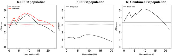 LOD score plots for binary and gray values on chromosome 13: (a) PBF2 population; (b) BPF2 population; (c) combined F2 population. The solid and dashed horizontal lines show genome-wide 5% and 10% significant threshold levels obtained by 10,000 permutations for each trait (see Table S8). The small vertical line on the x-axis indicates the position of each DNA marker.