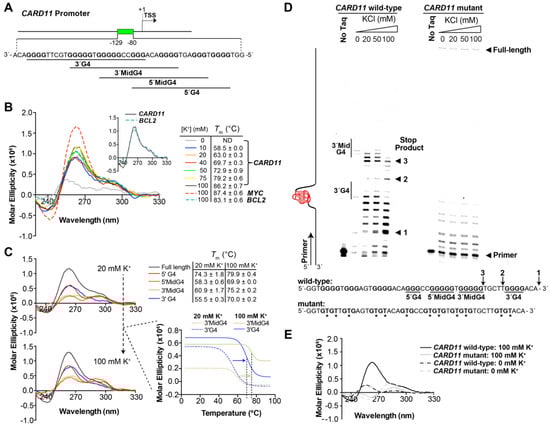 We discovered a G-rich sequence 80 bases upstream of the CARD11 transcription start site (TSS) consisting of 49 bases on the noncoding strand (Figure 1A) that is capable of folding into a stable G4 structure (Figure 1B). This purine dense element has a stretch of seven runs of 3 to 5 Gs with potential to form multiple G4 structures (Figure 1A,C,D), as often seen in G4 sequences that contain more than the minimum four runs of Gs [37,38]. The G4 signature of the full-length CARD11 oligomer demonstrates the typical K+-dependent CD spectra with a corresponding increase in thermal stability reflected in the melting temperature (Tm) that is comparable to the well-characterized MYC and BCL2 G4s (Figure 1B). The presence of a shoulder in the spectra around 290 nm indicates the CARD11 G4 most likely adopts a mixed antiparallel–parallel conformation and is supported by the spectral overlap with the BCL2 G4, which is known to exhibit the same folding pattern [37] (Figure 1B, inset). We then evaluated the ability of truncated CARD11 G4 sequences based on four consecutive G runs from the 5′ end, 5′ middle (mid), 3′ mid, and 3′ end of the full-length to form G4 structures. We observed that 5′ end and 3′ mid G4s displayed the highest thermal stability at both low and high K+ concentrations; however, the 3′ end G4 was substantially stabilized at 100 mM K+ with a 15.5 °C shift in Tm from 20 mM K+ (Figure 1C). We confirmed that the CARD11 oligomer forms stable G4s using the DNA polymerase stop assay where the ability of a polymerase to traverse a linear piece of DNA to produce a full-length product is leveraged to observe shorter, terminated products when the polymerase encounters a G4 and cannot continue to synthesize the DNA from the template. We observed three major stop products for the CARD11 wild-type sequence with increasing KCl concentrations, which most likely represent 3′ end, 3′ mid, and 5′ mid G4s (Figure 1D). The prominent, KCl-dependent 3′ end stop product is consistent with the marked increase in stability of the 3′ end G4 observed in the Tm analysis upon increasing K+ from 20 mM to 100 mM (Figure 1C). Similarly, 3′ mid G4 exhibited a notable shift in Tm (Δ14.3 °C) and a corresponding increase in a stop product near the presumed location of this G4 (stop product 2; Figure 1D, Supplementary Figure S4A). With the increase in stop products 1 and 2 at higher K+, there was a reduction in stop product 3 that was prominent at lower K+ (Figure 1D). As expected, based on the inability of the CARD11 mutant, a sequence where at least one G from each of the seven runs was substituted with a thymine to form a G4 structure according to CD spectroscopy (Figure 1E), and there were no distinct stop products formed and a full-length product is visible even at high KCl concentrations.