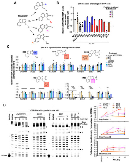 The following supporting information can be downloaded at: https://www.mdpi.com/article/10.3390/genes13071144/s1, Materials and Methods: Detailed synthesis of each analog and Molecular modeling; Figure S1: Purity of NSC373981 by HPLC; Figure S2: Purity of NSC373981 synthesis (R47) and analogs by UPLC or HPLC; Figure S3: 1H NMR and 13C NMR spectra of synthesized NSC373981 (R47) and analogs; Figure S4: Replicate DNA polymerase stop gels of the CARD11 G-quadruplex forming sequence; Figure S5: Unadjusted DNA polymerase stop gels of the CARD11 wild-type and mutant G-quadruplex forming sequences for base identification; Figure S6: NSC373981 and R158 stabilization of the BCL2 G-quadruplex; Figure S7: Computational modeling of R47 in an NMR generated structure of the MYC G-quadruplex; Figure S8: Cytotoxicity and determination of growth inhibitory concentrations of NSC373981 and analogs; Figure S9: Basal levels of CARD11 mRNA; Figure S10: PDS qPCR of CARD11, BCL2, MYC, KRAS, and TERT; Figure S11: Replicate DNA polymerase stop gels of PDS and NSC373981 stabilization of the CARD11 G-quadruplex forming sequence; Figure S12: Replicate DNA polymerase stop gel of NSC373981 and analogs with the CARD11 G-quadruplex forming sequence; Table S1: Oligonucleotide sequences used in this study; Table S2: STR analysis of the DLBCL cell lines.
