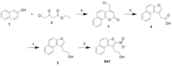 The synthesis of nitro-naphthofuran ethanol R47 has been previously described and is outlined in Scheme 1 [36]. Briefly, a Pechmann condensation was completed between naphthol (1) and ethyl-4-chloroacetoacetate (2) to yield an oxobenzopyran intermediate (3), which was converted to naphthofuran acetic acid (4) via alkaline ring contraction. The reduction of naphthofuran acetic acid by lithium aluminum hydride produced naphthofuran ethanol (5), and it was nitrated using nitric acid to yield nitro-naphthofuran ethanol, R47. 2-(2-nitronaphtho [2,1-b]furan-1-yl)ethan-1-ol (R47): Yield: 33%, 1H NMR (400 MHz, dmso) δ 8.47–8.42 (m, 1H), 8.14 (d, J = 9.1 Hz, 1H), 8.09 (dd, J = 8.1, 1.4 Hz, 1H), 7.82 (d, J = 9.1 Hz, 1H), 7.72 (ddd, J = 8.4, 7.0, 1.4 Hz, 1H), 7.61 (ddd, J = 8.1, 7.0, 1.1 Hz, 1H), 5.02 (s, 1H), 3.79 (t, J = 7.1 Hz, 2H), 3.62 (t, J = 7.0 Hz, 2H).13C NMR (101 MHz, dmso) δ 150.48, 149.64, 133.26, 131.24, 130.34, 128.81, 128.67, 126.47, 124.17, 123.41, 121.39, 112.77, 59.70, 29.54.