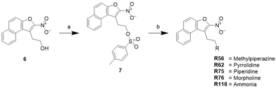 The synthesis of nitro-naphthofuran amines is outlined in Scheme 2. The nitro-naphthofuran alcohol (6) was activated with toluene sulfonyl chloride (7), which was then subjected to nucleophilic replacement with different amines to generate R56, R62, R75, R76, and R118.