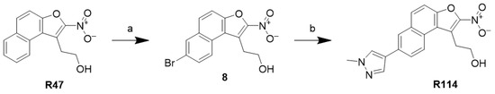 2-(7-(1-Methyl-1H-pyrazol-4-yl)-2-nitronaphtho[2,1-b]furan-1-yl)ethan-1-ol (R114): Yield: 56%, 1H NMR (400 MHz, cdcl3) δ 8.37 (d, J = 8.4 Hz, 1H), 8.01–7.95 (m, 2H), 7.98–7.91 (m, 1H), 7.68 (d, J = 8.9 Hz, 1H), 7.64–7.55 (m, 1H), 7.51–7.43 (m, 1H), 4.49 (t, J = 7.7 Hz, 2H), 4.00 (s, 3H), 3.50 (t, J = 7.7 Hz, 2H). m/z (ESI) calculated for C18H15N3O4 [M+H]+: 338.11, found: 338.59.