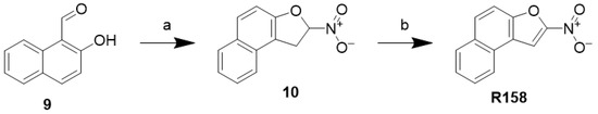 Synthesis of nitro-naphthofuran compound is outlined in Scheme 5. Bromontiromethane was added to reacted with naphthaldehyde (9) to generate intermediate (10). Following this, 10 was refluxed in acetic anhydride to generate nitro-naphthofuran R158.