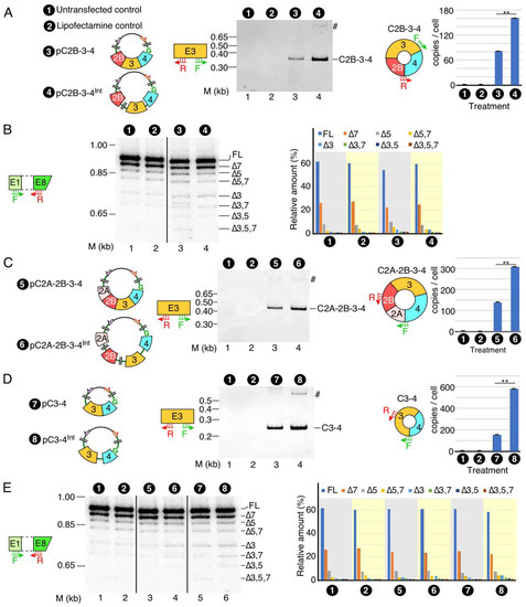 The human SMN genes code for a vast repertoire of circRNAs. The most abundant of these circRNAs are generated by the first four internal exons, e.g., exons 2A, 2B, 3 and 4. However, the mechanism of their production remains unknown. We began this study with the construction of a mammalian expression vector that allowed overexpression of C2B-3-4, an SMN circRNA comprised of exons 2B, 3 and 4. The expression of C2B-3-4 was enabled by a strong RNA:RNA duplex that brought the downstream 5′ss of exon 4 in proximity with the upstream 3′ss of exon 2B, forcing backsplicing between these two splice sites (Figure 2A). Despite the absence of introns 2B and 3, the expression of C2B-3-4 from the vector was 1000-fold higher than the background level expression in the untransfected cells. Employing a similar approach, we generated two non-SMN circRNAs containing eGFP and HIPK2 sequences. High expression of these non-SMN circRNAs suggested that backsplicing was primarily driven by the common RNA:RNA duplex that brought the splice sites together. The SMN genes generate multiple alternatively spliced transcripts due to skipping exons 3, 5 and 7 in different combinations [31]. We observed no effect of overexpression of any of the circRNAs on the relative abundance of splice isoforms generated from the endogenous SMN.