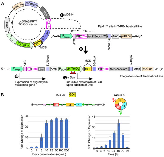 We selected a lead clone (colony 6, hereafter referred to as TC4-2B) to perform further characterization. TC4-2B displayed low baseline (leaky) expression of C2B-3-4 and higher fold change in expression of C2B-3-4 after induction with Dox. We then used a broad concentration range of the antibiotic to monitor expression of C2B-3-4 in TC4-2B cells (Figure 4B). We observed a dose-dependent increase in expression of C2B-3-4 in the Dox concentration range from 1 to 10 ng/mL. We chose a 5 ng/mL Dox treatment to determine the time at which C2B-3-4 was maximally expressed. We collected samples at eight time points, starting from 0 h to 96 h after the initiation of Dox treatment. We observed a progressive increase in C2B-3-4 levels with time until 48 h after single Dox induction (Figure 4B). At the peak of expression, we recorded a more than 30-fold increase in the C2B-3-4 levels compared to the background level of expression at the 0 h time point. Of note, the C2B-3-4 levels produced by TC4-2B cells were comparable to those observed with the transient transfection at the highest plasmid concentration we tested. Hence, we consider the expression level of C2B-3-4 from TC4-2B cells as robust given the fact that transcripts were generated from a single transgene inserted within the genome compared to potentially thousands of copies of plasmid within a single nucleus in the case of transient transfection [33]. The half-life of Dox was reported as ~48 h at 37 °C [34,35]. Consistently, we observed a substantial drop in the C2B-3-4 expression level after 48 h of Dox treatment.