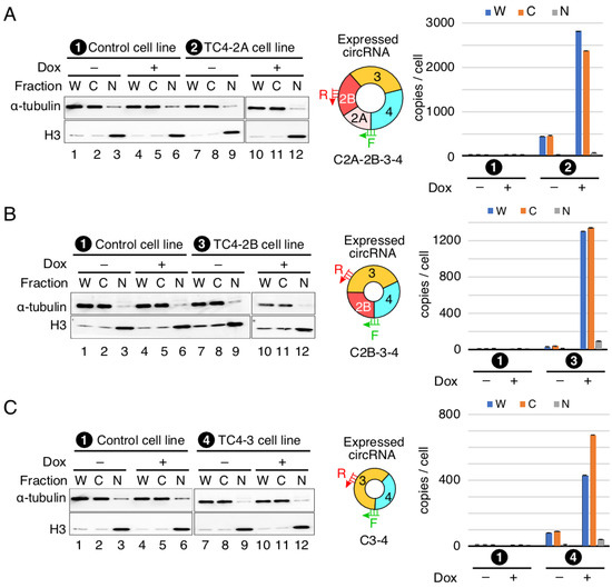 We examined the nuclear and cytoplasmic distribution of SMN circRNAs in stable cell lines designed to overexpress SMN circRNAs upon induction with Dox. We used histone H3 (H3) and α-tubulin as markers to distinguish nuclear and cytoplasmic fractions, respectively. The results of the Western blot show the expected distribution of α-tubulin and H3 (Figure 6), confirming the optimal fractionation of cellular extracts we employed in our localization studies. The results of the qPCR using RNA prepared from the nuclear and cytoplasmic fractions show that overexpressed SMN circRNAs were localized in the cytoplasm (Figure 6). These findings are consistent with previous reports showing predominant cytosolic localization of the exon-only-containing circRNAs [36,37].