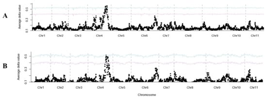High-throughput Illumina whole genome resequencing of the two parent lines (Z-1-4 and Y1) and two bulks (CR and DCR) were carried out, which generated 9.04 million (2.71G), 11.58 million (3.48G), 30.60 million (9.18G) and 32.15 million (9.65G) clean reads, respectively. Main statistics are provided in Supplementary Table S2. SNP calling was performed through a DNA-BSA-pipeline using OHB3-1 (ASM199503v1), as the reference contained only scaffolds but not chromosome-level assemblies [5]. Δ(SNP index) was calculated between two bulks, and 100 SNPs with the highest Δ(SNP index) values at a depth threshold ≥20 were identified, which were provided in Supplementary Table S3. Among them, 31, 55 and 6 loci were from scaffolds NW_019104493.1, NW_019104505.1 and NW_019104528.1, respectively. It turned out that the three scaffolds were located in a region of bitter melon chromosome 4 (Chr4) in the updated draft genome assembly of OHB3-1 [4] and the genome assembly of Dali-11 [6]. Indeed, we conducted SNP calling of the resequencing reads of the two OHB3-1 and Dali-11. The genome-wide Δ(SNP index) graphs are shown in Figure 2A,B, respectively. In both genomes, a single Δ(SNP index) peak was present on Chr4, which was consistent with single locus cr controlling the ridge pattern in this population.