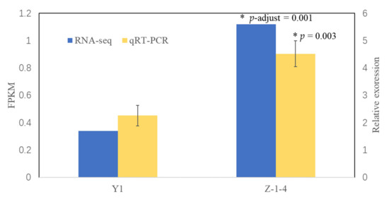 Expression analysis of McEPFL2 in fruit epidermal tissues in Z-1-4 and Y1 by RNA-seq (blue) and qRT-PCR (yellow). Error bars are mean ± standard error. Significance of expression level was made between the two genotypes in each experiment with t-tests. Asterisks (*) means p < 0.05 by student’s t-test.
