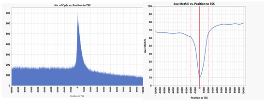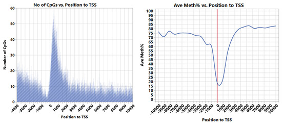 Number of CpGs per nucleotide (left) and their average methylation percentage relative to TSS (right). The average percent of CpGs methylation flanking TSS was 57.7% within ±10 kb and 31.6% within ±2 kb, reaching as low as 12% near the TSS.