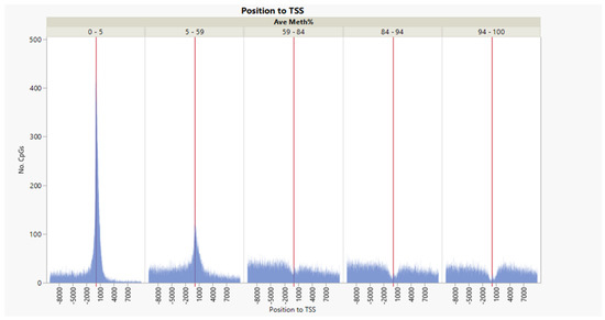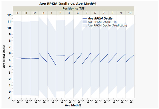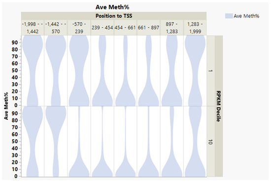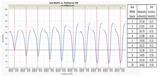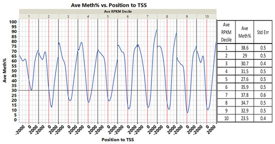 Within ±1 kb of the TSS, there was a negative correlation between the average DNA methylation percent and gene transcription expression deciles (Figure 3, correlation multivariate = −0.2046, p < 0.0001, nonparametric Spearman’s correlation = −0.2098, p < 0.0001). The average percentage DNA methylation within ±1 kb of the genes’ TSS at the first decile (lowest) of the expression range was 37.2%, compared to 14.6% in the 10th decile (highest) (Figure 4).